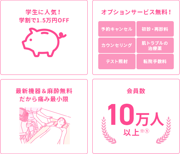 学生向けなので他の医療脱毛よりも安めに契約できました!クリニック内も新しく、とても綺麗です。靴も履き替えるので清潔です。初めての方も安心できると思います!