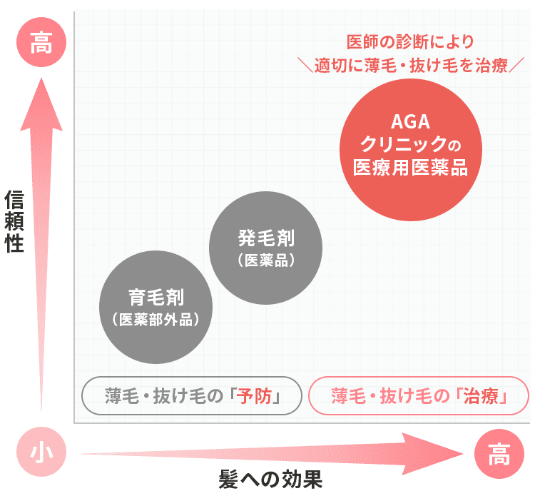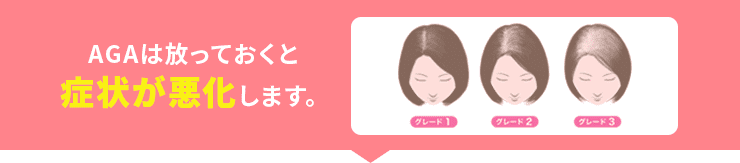 AGAとは進行性の病気で徐々に薄毛や抜け毛が進行してしまう脱毛症の1つです。症状が進行してしまうとセルフケアや市販の薬では改善することが難しいため、専門のクリニックで早めに治療を始めることをオススメします。